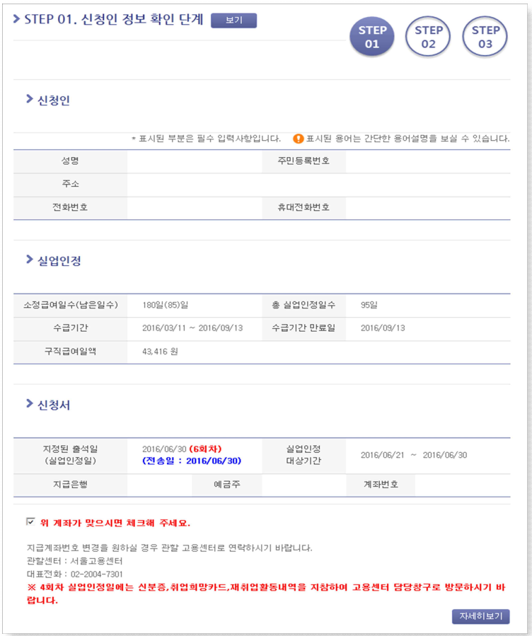 등록된 계좌로 구직급여를 받고자 한다면 위 계좌가 맞으시면 체크해 주세요. 그림과 같이 체크를 하시고 다음 단계로 넘어가시면 됩니다.