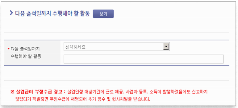 다음 출석일까지 수행해야 할 활동 아래 화살표를 클릭하여 다음 실업인정일까지 어떤 재취업활동(구직활동 및 구직활동 외 활동)을 할 것인지 선택하고 임시저장 다음단계로 넘어가면 됩니다.
