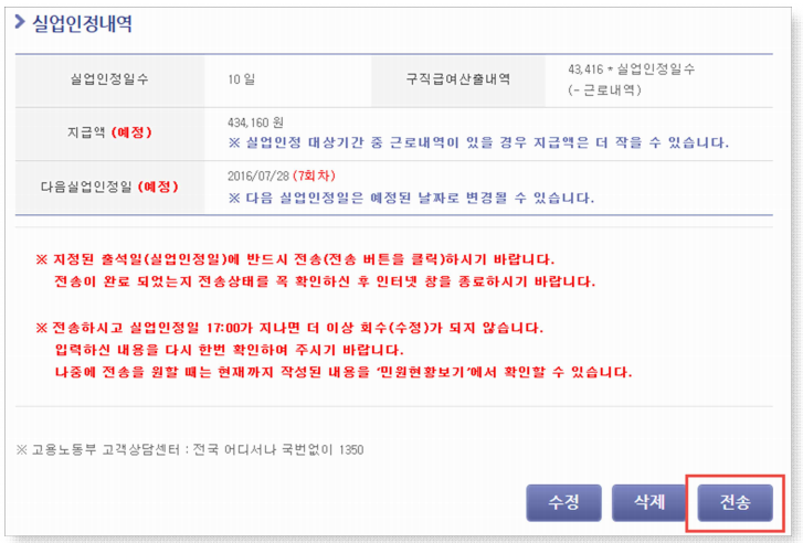 ※ 전송은 실업인정일이 아니라면 전송이 불가능합니다. 전송이 되었다 하더라도 인정을 받을 수 없습니다. 실업인정 당일 오전중에 전송하여 주시기 바랍니다.