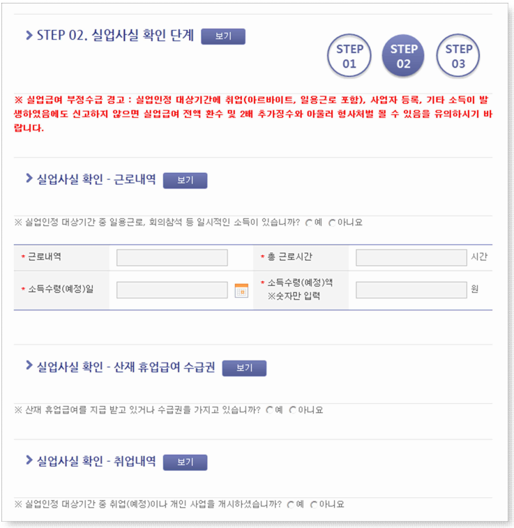 ※ 이부분은 사실과 다르게 신고할 경우 부정수급이 될 수 있습니다. 사실 그대로 신고하여 주십시오.