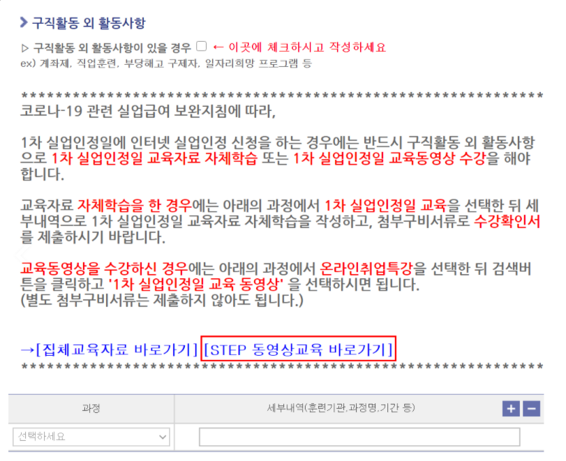 1차 실업인정 교육동영상은 스크롤을 내려 보면 아래와 같이 구직활동 외 활동사항이 있을 겁니다.